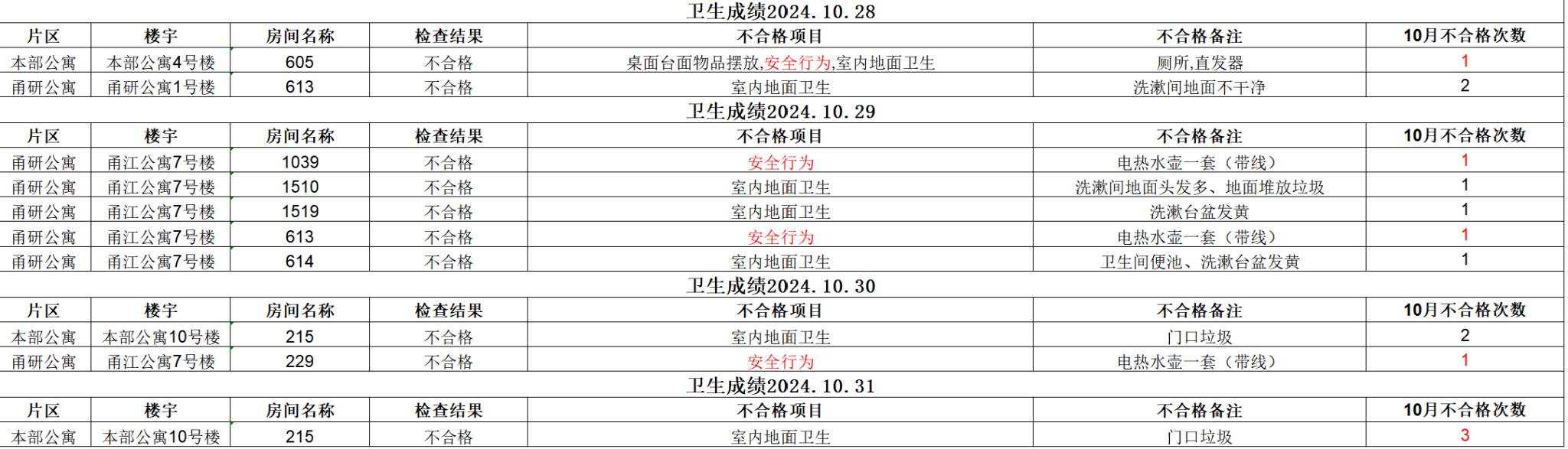 经校学生社区服务中心的检查,现对10月28日-10月31日卫生检查不合格的寝室予以公示,详见下表。