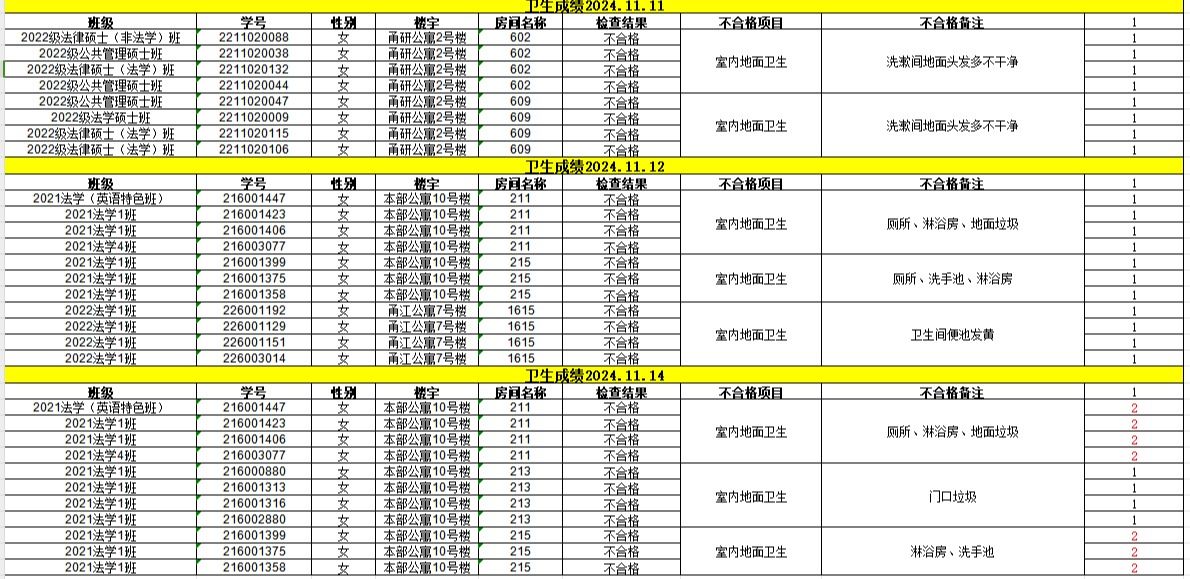经校学生社区服务中心的检查,现对11月11日-11月15日卫生检查不合格的寝室予以公示,详见下表。