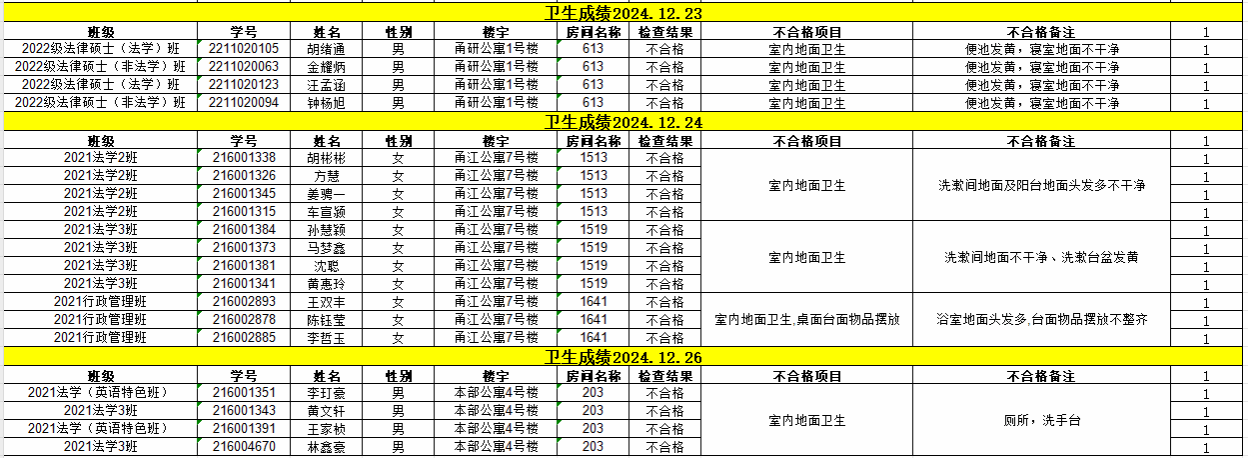 经校学生社区服务中心的检查,现对12月23日-12月27日卫生检查不合格的寝室予以公示,详见下表。