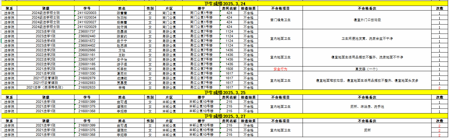 经校学生社区服务中心的检查,现对3月24日-3月28日卫生检查不合格的寝室予以公示,详见下表。