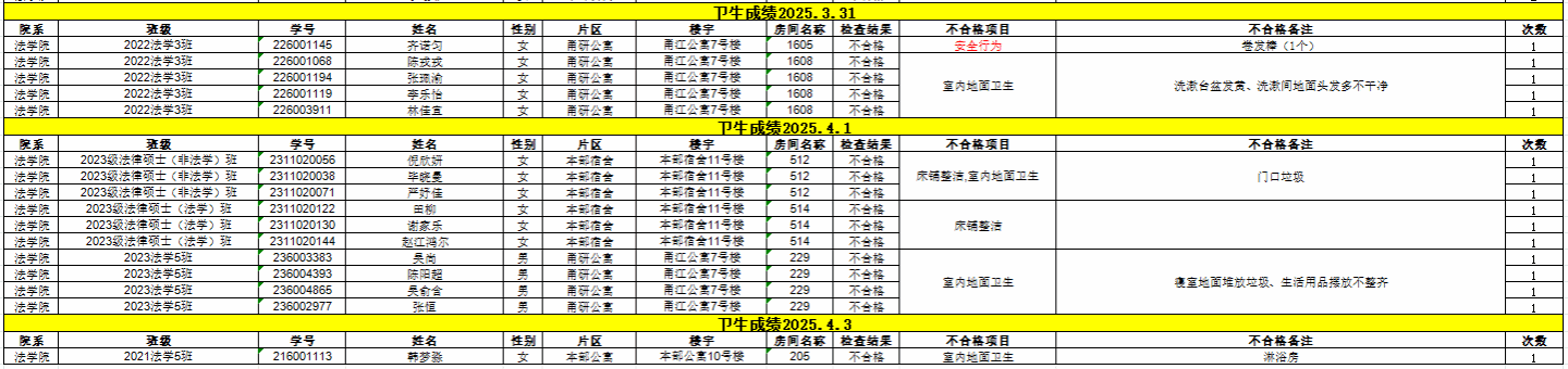 经校学生社区服务中心的检查,现对3月31日-4月3日卫生检查不合格的寝室予以公示,详见下表。