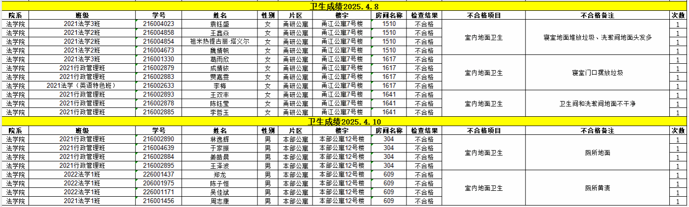 经校学生社区服务中心的检查,现对4月7日-4月11日卫生检查不合格的寝室予以公示,详见下表。