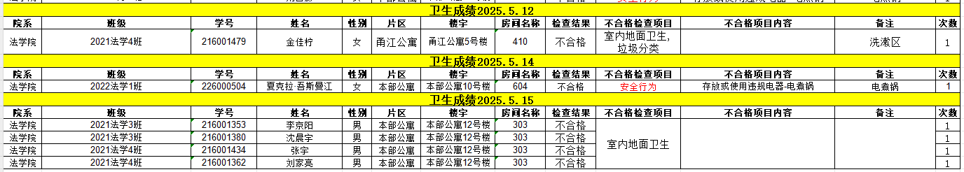 经校学生社区服务中心的检查,现对5月12日-5月16日卫生检查不合格的寝室予以公示,详见下表。