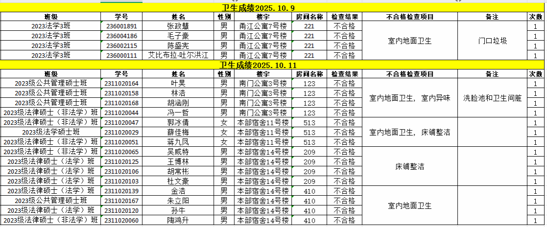 经校学生社区服务中心的检查,现对10月9日-10月11日卫生检查不合格的寝室予以公示,详见下表。