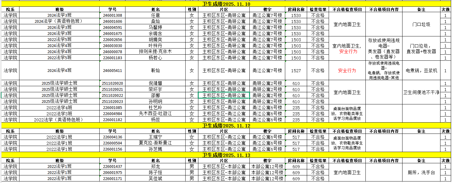 经校学生社区服务中心的检查,现对11月10日-11月14日卫生检查不合格的寝室予以公示,详见下表。