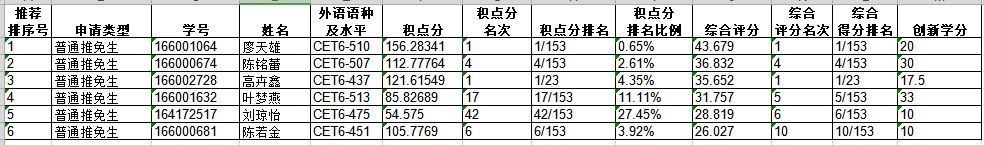 为5人。按照1:1.5推免比例,全部推荐,排序依据综合排名(廖天雄、陈铭蕾、高卉鑫、叶梦燕、刘琼怡、陈若金)