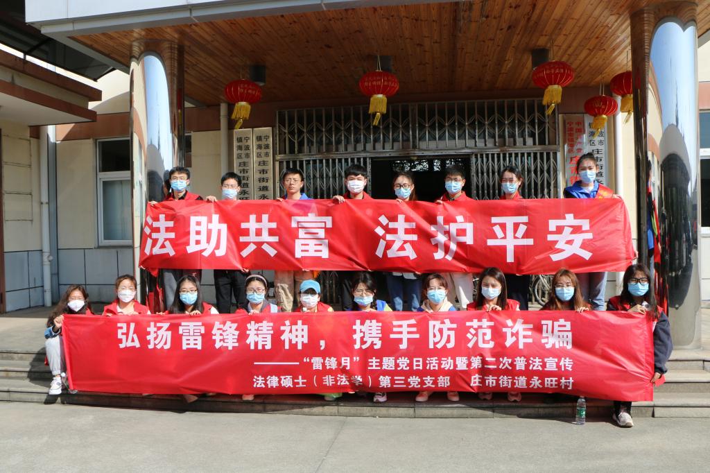 法律硕士(非法学)第三党支部联合镇海区法律援助中心共计20余位志愿者化身反诈宣传员,在镇海区永旺村开展“弘扬雷锋精神,携手防范诈骗”活动。