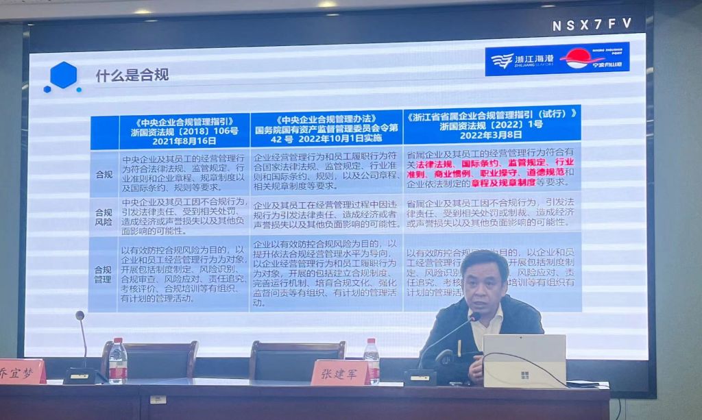 接着,张主任深度剖析合规管理建设,对合规的概念、必要性以及合规建设的好处进行了深入浅出的讲解,围绕重点内容、重要环节、重点人员三个方面解构合规管理建设。张主任表示,建设法治国企是全面落实依法治国战略的必然要求,合规管理是国企落实国家全面依法治国战略的重要举措。对企业而言,“依法经营”实际上就是“依规经营”,“依法治企”就是“依规治企”,合规管理建设既是保护企业及其领导、职工的重要手段,也是提升国企市场竞争力、提升风险防控能力的重要方式。