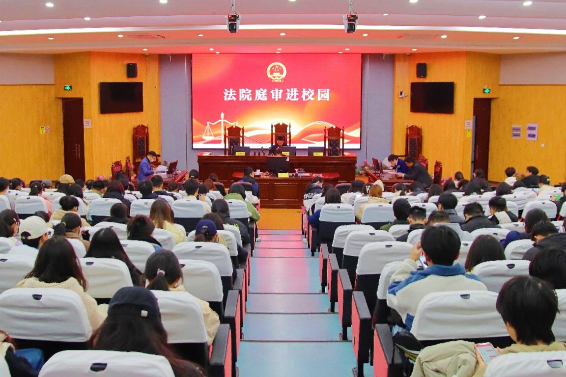 师生200余人旁听庭审。一场“校园内”的审判让现场旁听同学备感激动。在庭审过程中,双方当事人围绕交通事故责任认定书、医疗收据等进行了举证,整个庭审过程严谨有序。同学们认真旁听了举证质证、法庭辩论等各个环节,直观感受到法庭的庄严。