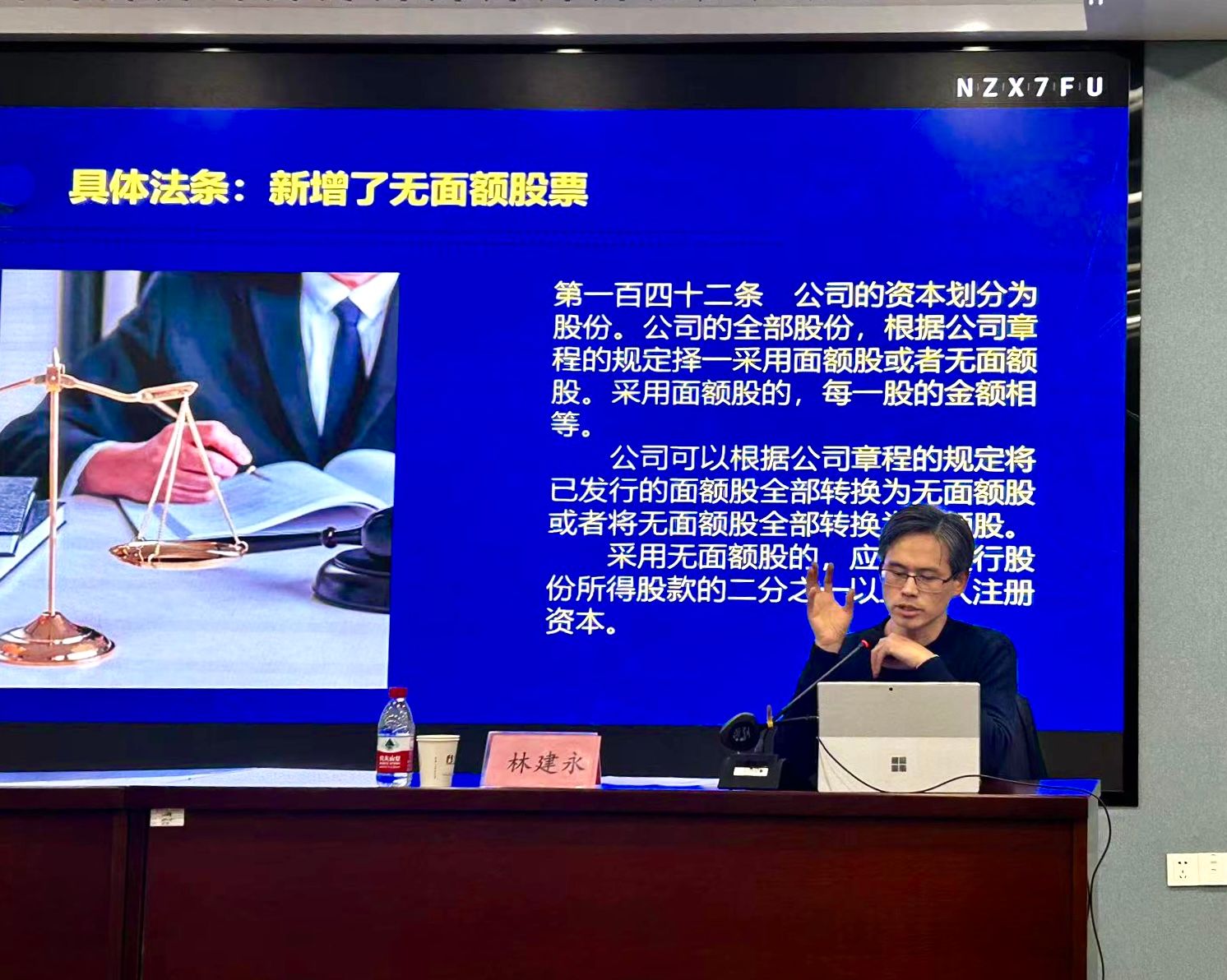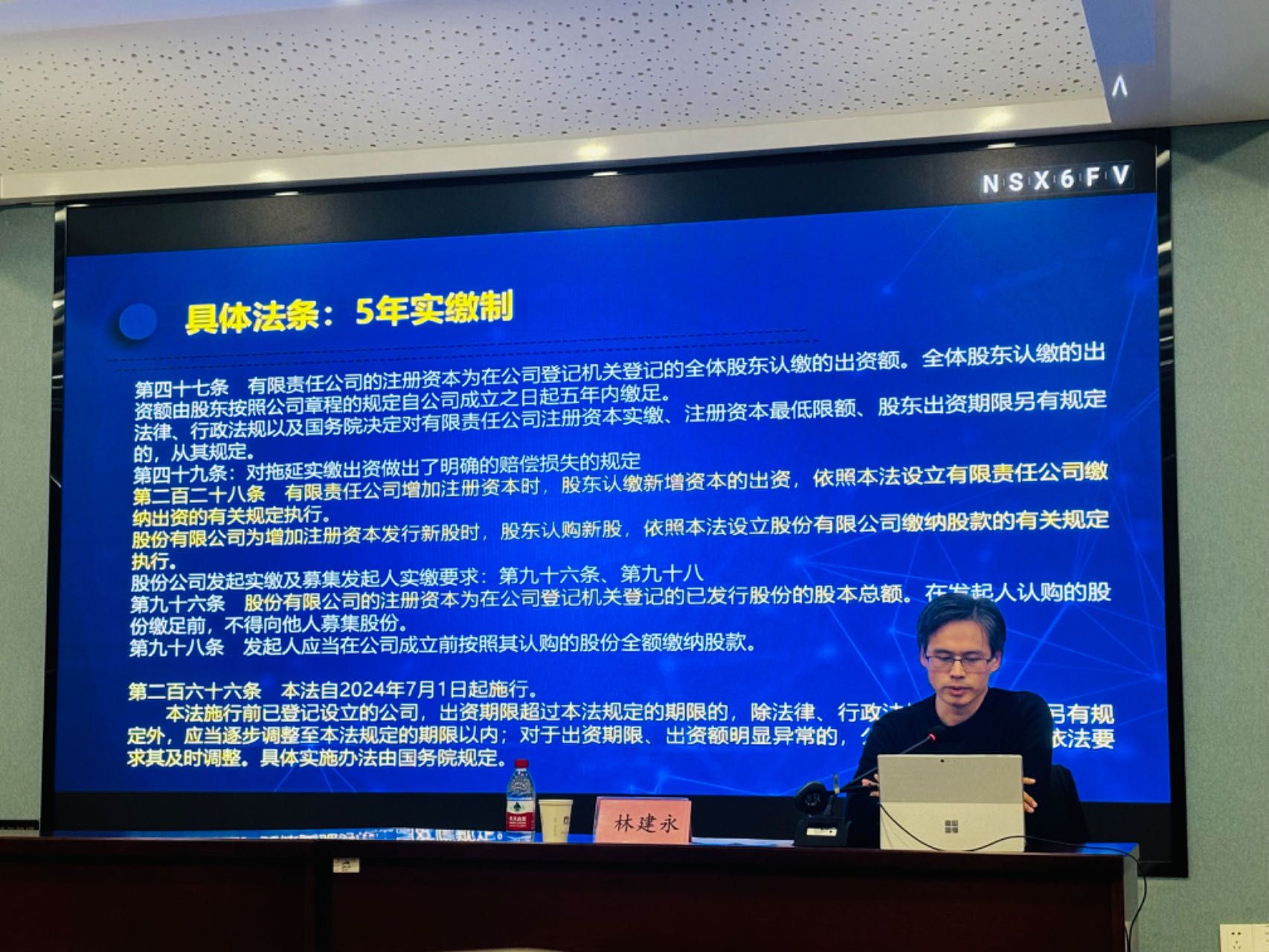 讲座伊始,林建永老师从我国公司法的制定历程切入,提到我国公司法在2021年、2022年以及2023年8月、12月共进行了四次审议并最终通过,新修订的公司法将于2024年7月1日正式施行。并以自身实务经历为例,引出公司法就充实注册资本方面的新变化,修订后的公司法对有限责任公司注册资本认缴制作出了一定限缩,要求“全体股东认缴的出资额由股东按照公司章程的规定自公司成立之日起五年内缴足”,强制规定有限公司股东最长认缴出资期限,同时明确法律、行政法规以及国务院决定可以对注册资本实缴及最低限额、股东出资期限作出特别规定。林建永老师还引用了刑法虚假出资、抽逃出资罪的相关规定对其进行解读。