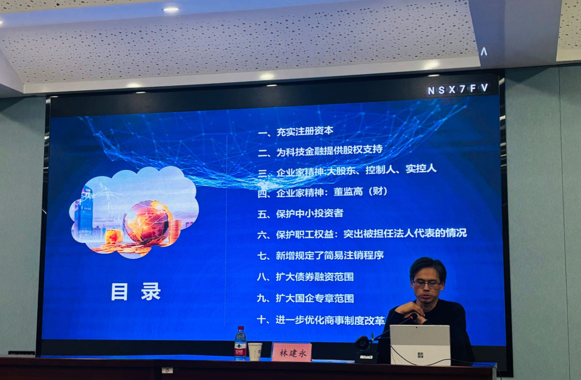 接着,林建永老师表示,新公司法还完善了限制董监高关联交易、谋取公司商业机会及同业竞争的规定,并逐一介绍了在公司日常交易中董监高及股东的相关法律风险。此外,公司法还增设审计委员会及董事离任规定,规范董事会出席及表决人数、取消董事会成员上限。同时,修订后的条款强化了控股股东、实际控制人的责任,加强了对中小投资者和职工的权益保护,比如中小股东的回购权、知情权和提案权。在对职工的权益保护上,林老师详细解读了新公司法中职工被担任法人代表的情况。随后,林老师谈到,新公司法增加了横向法人人格否认制度、简易合并规则、简易注销程序等,明确了股东会决议效力瑕疵不影响公司与善意相对人的法律关系。并就企业债券融资范围和国企专章范围扩大等新变化逐一进行解读。