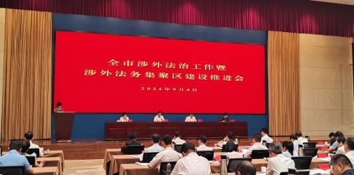 9 月 4 日上午,为深入学习贯彻习近平总书记关于涉外法治建设重要论述精神、全省涉 外法治工作会议精神,总结交流宁波市涉外法治建设工作,研究部署下阶段重点任务,加快 推进我市涉外法治工作体系和能力建设,全市涉外法治工作暨涉外法务集聚区建设推进会在 市行政会议中心顺利召开。省司法厅领导,市委、市政府领导发表重要讲话,市司法局、市 商务局、市贸促会及市中级人民法院主要负责人上台发言,涉外法治建设协调小组成员单位 及有关单位分管领导参会。