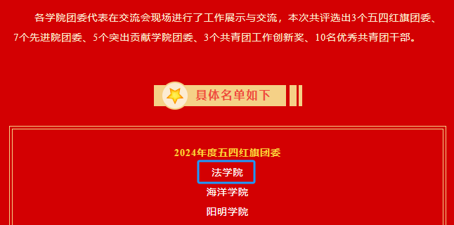 团委在过去三年中连续获评“先进院团委”,《“三维”协同,构建“卓越法治人才”实践育人模式》项目获得2024年度共青团工作创新奖。共青团工作年度评比包含基础工作量化考评和工作述职两部分,经过综合评定,金沙娱乐网