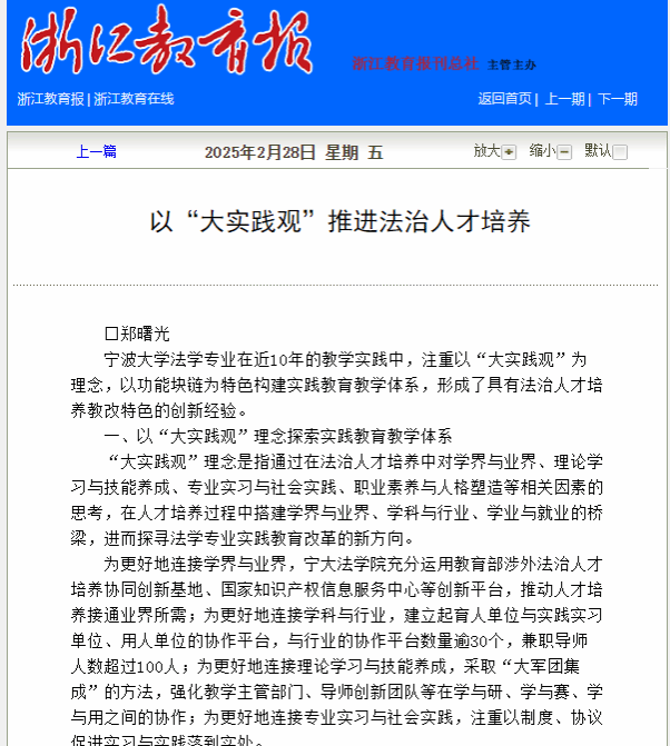 郑曙光教授的《以“大实践观”推进法治人才培养》的文章在浙江教育报显著位置刊发,标志着金沙娱乐网