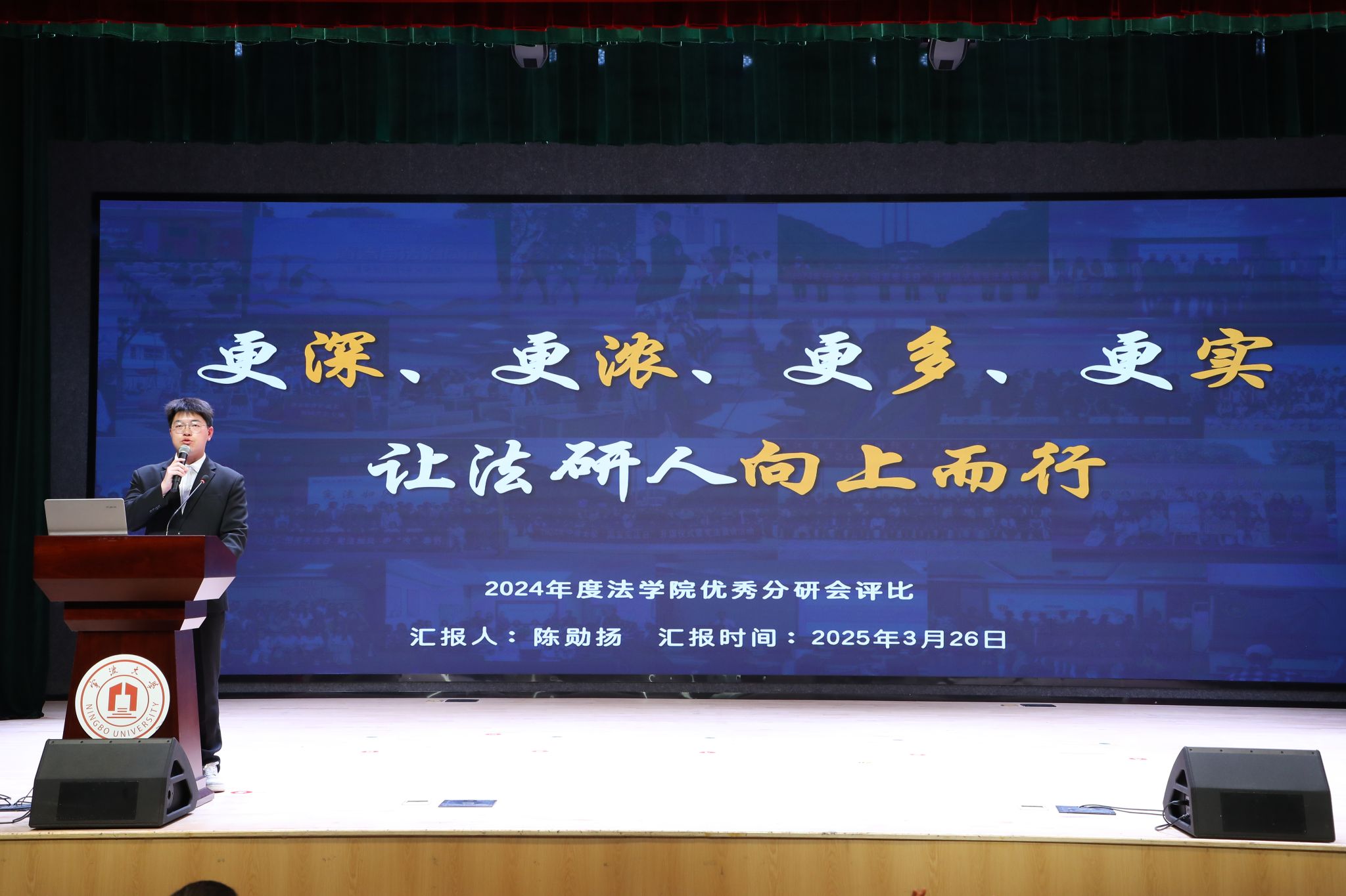 从18个参评单位中脱颖而出。在成果展示环节,院研究生会陈勋扬以“四好”工作体系为核心,通过“思悟领航”“研学赋能”“文体聚力”“实践筑基”四大模块,系统呈现了思想引领、学术创新、文化培育、社会服务等方面的工作实绩,最终以绝对优势折桂。