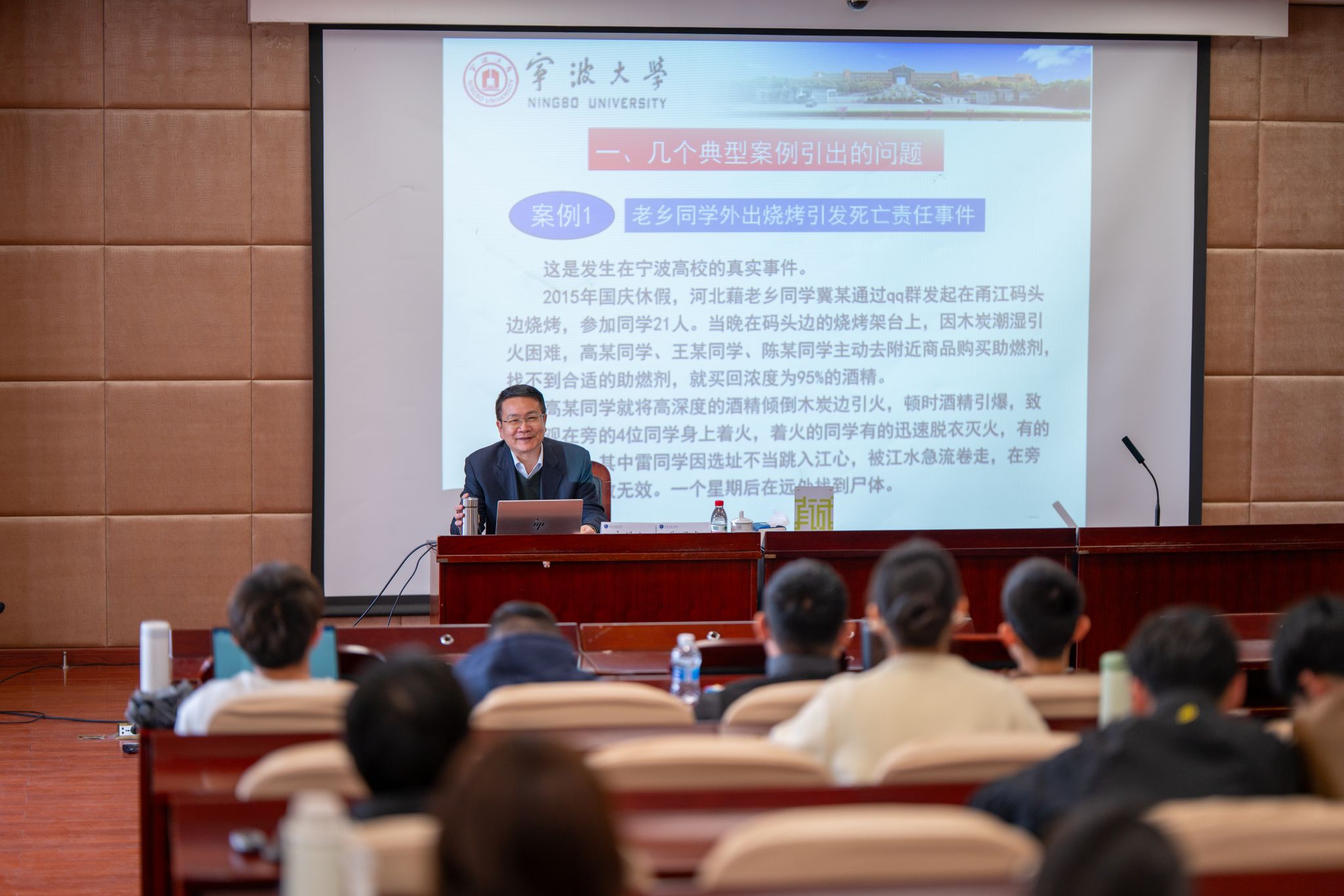 郑曙光教授通过一系列真实案例,生动展现了违法或忽视法律风险所带来的严重后果。这些案例极具代表性,包括“河北籍大学生外出烧烤引发的死亡责任事件”、“套路贷案导致学生家长被迫卖房还债”、“研究生因信用问题被拒录公务员”、“在校学生对室友投毒案”、“职校生宿舍高空抛物致人伤害案”,以及“大学毕业生警官知法犯法”,覆盖了校园生活、金融安全、社会信用、刑事犯罪、民事侵权、公共秩序等多个维度。这让在场师生深刻意识到法律与生活的息息相关,启示大家尊法守法的细节性与不可或缺性。