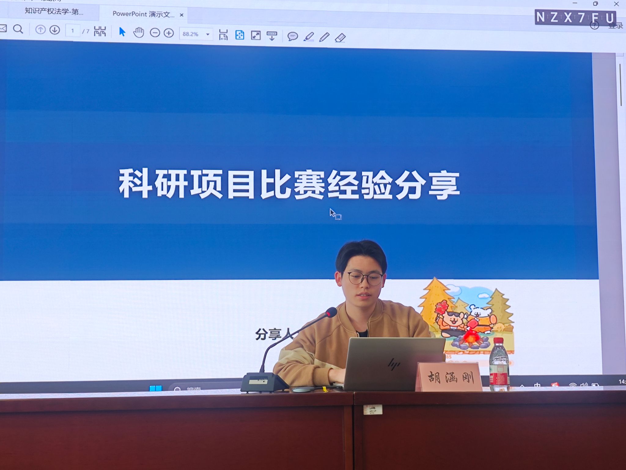 2023级公共管理专业研究生胡涵刚从选题、团队组建几个方面进行经验分享。他详细介绍了科研比赛的构成与分工,从选题方面要做到的大选题、小切入,到团队组建中答辩、联络工作、文本工作的具体分工,再到前期的准备工作和答辩中的技巧,令在场的同学受益匪浅。