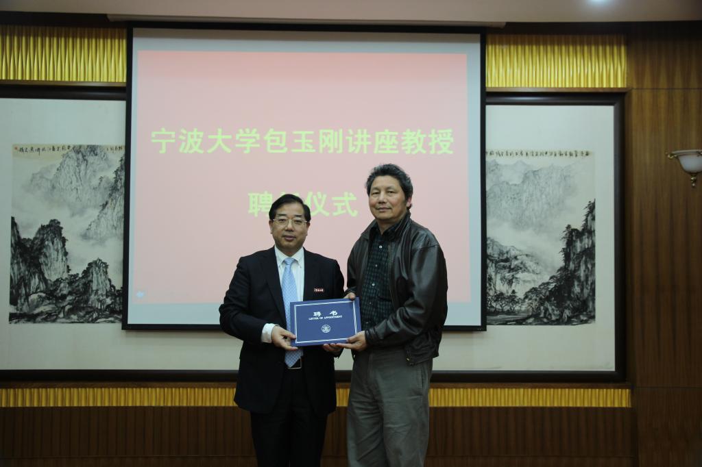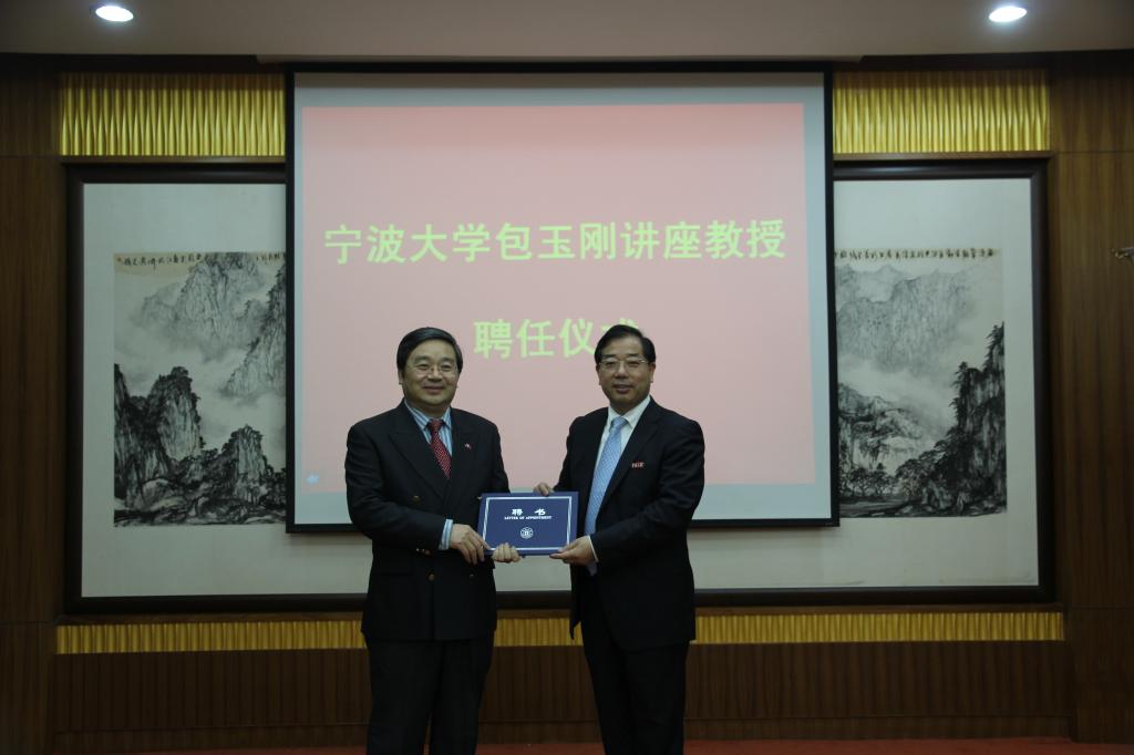 包玉刚讲座教授。校长沈满洪出席聘任仪式并向两位教授颁发证书、佩戴校徽。法金沙娱乐网