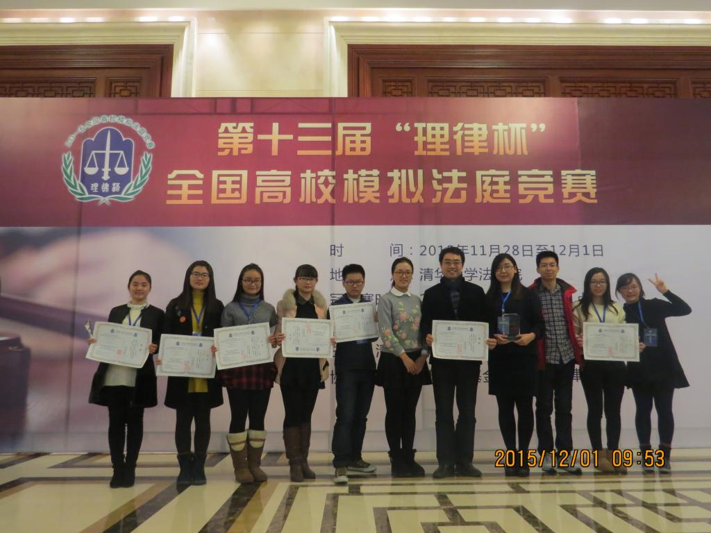 蔡先凤、冯一文、王慧老师担任指导老师。在口头辩论比赛中,由王淑君、钱虹同学担任原告方,徐海萍、金锐鹏担任被告方,与湖南大学、北京大学、南开大学以及上海财经大学就环境侵权案件分别进行比赛,双方选手唇枪舌剑,展现了专业的素质、熟练的辩论技巧、淡定从容的心态,获得了评委的一致认可,并提出了改进建议。12月1日晚,进行了颁奖典礼。
