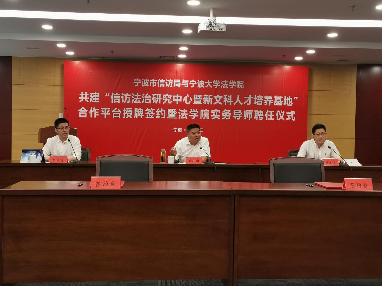 与宁波市信访局共同举行双方共建的“信访法治研究中心暨新文科人才培养基地”合作平台签约揭牌仪式。由市信访局信访督查专员杨永宗主持。市委副秘书长、信访局局长孙小雄,市信访局办公室、综合指导处、办信处、接访处、督查处、复查复核处等处室处长、金沙娱乐网