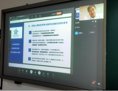保险法课堂邀请到上海星瀚律师事务所的李洪伟律师,通过在线课堂方式和同学们交流《海上保险法律实务》。在课堂上,李律师介绍了海上保险的分类和条款、市场参与主体、海上保险的特殊制度,也通过案例分析了海上保险实务的最新发展,最后分享了他本人从事海上保险及相关法律实务的思考和心得,建议同学们加强学习,在学习中找寻自己感兴趣的领域,深耕细作。本次在课堂教学活动中邀请到实务人士的参与和分享,也是金沙娱乐网