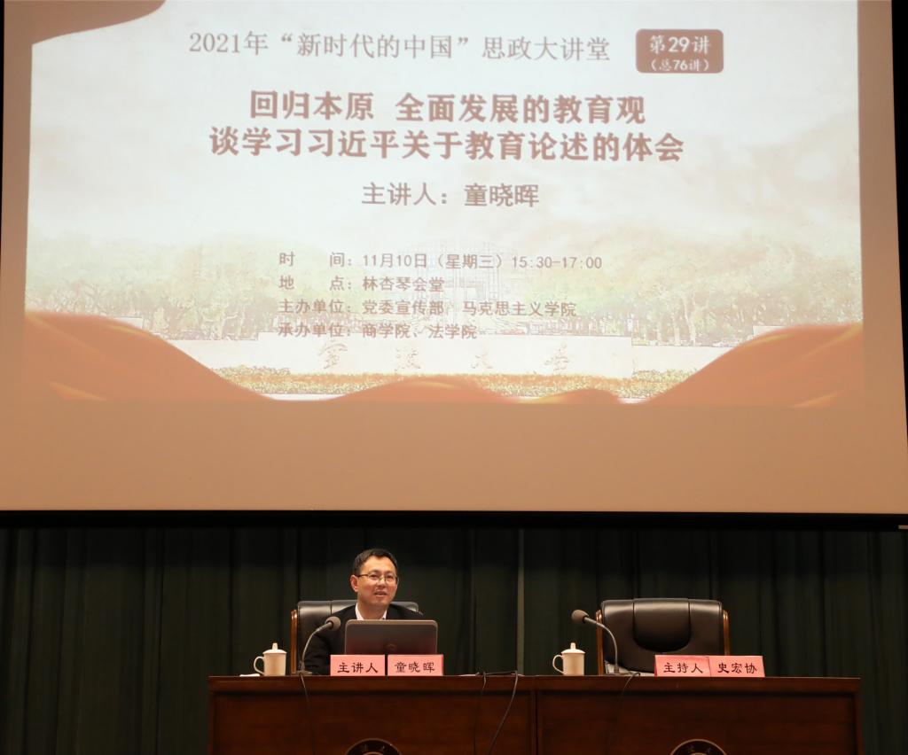 11月10日下午,校党委副书记童晓晖在林杏琴会堂以“回归本原全面发展的教育观——谈学习习近平关于教育论述的体会”为主题,为金沙娱乐网