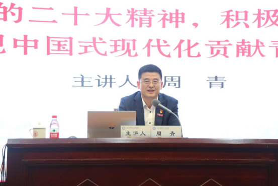 11月16日,校党委委员、党委宣传部部长周青在真诚图书馆报告厅以“深入学习党的二十大精神,积极投身创新创业,为实现中国式现代化贡献青春力量”为题为金沙娱乐网
