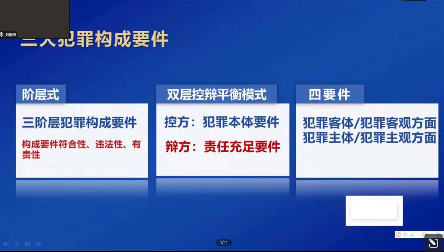 首先,尹法官先向同学们介绍了出罪、犯罪构成要件的来源以及含义。出罪的主要内容为以下三点:第一出罪的主体是公检法监察委等机关。第二出罪的对象是进入犯罪判定圈的行为。第三出罪的结果是行为不被认定为有罪。