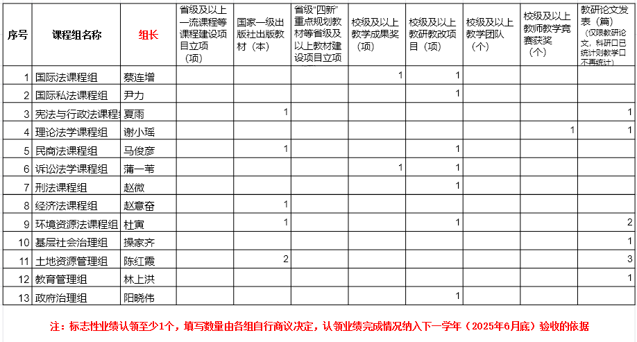 2、结合各课程组于2024-2025学年初认领的标志性业绩(见附件1)填写课程组已完成的本科教学标志性业绩表(见表1);