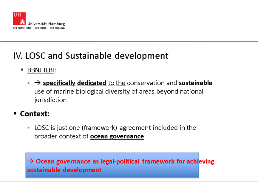 《海洋法公约》可以成为一项推进可持续发展的工具,还是会成为实现“可持续发展目标”的障碍?教授强调,虽然目前LOSC面临不小的挑战,但是不能就此否认其对海洋保护的重要作用从而认为会变成实现可持续发展的障碍。随后教授通过引用一系列有关海洋生态保护的公约、约定,阐述了“海洋治理作为法律-政治框架实现可持续发展”的观点。