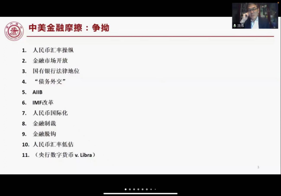 接着,沈教授继续带领同学们进一步探讨中美之间的金融摩擦争拗,主要体现在人民币汇率操纵、金融市场开放、国有银行法律地位、“债务外交”、AIIB、IMF改革、人民币国际化、金融制裁、金融脱钩、人民币汇率低谷和央行数字货币。进而由此分析了中美间的金融摩擦走向:从贸易逆差到投资、金融;从局部到全面;从传统议题到新议题,从双边谈判到多边争端解决;从法律议题到机制性议题; 从国际法到国内法;从被动到主动;从金融制裁到反金融制裁等。